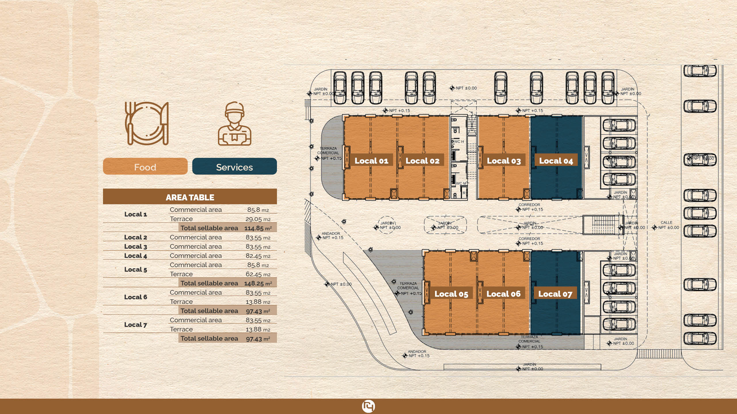 - 5 of the commercial spaces are equipped with the necessary facilities to be used for food sales and/or restaurants.